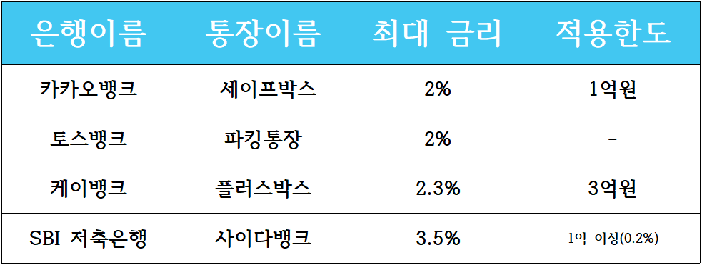 일반적으로 돈이 생기면 은행에 넣어 놓습니다. 예금이나 적금으로 하시는 분들도 있지만 어떻게 될지 몰라 그냥 파킹통장에 넣어 놓는 분들이 많은데요. 이왕 넣어놓는 거 이자를 많이 주는 곳에 넣어 놓는게 아무래도 좋겠죠. 그래서 현재 파킹통장으로 인기가 있는 곳 4군데를 알아보려고 합니다.